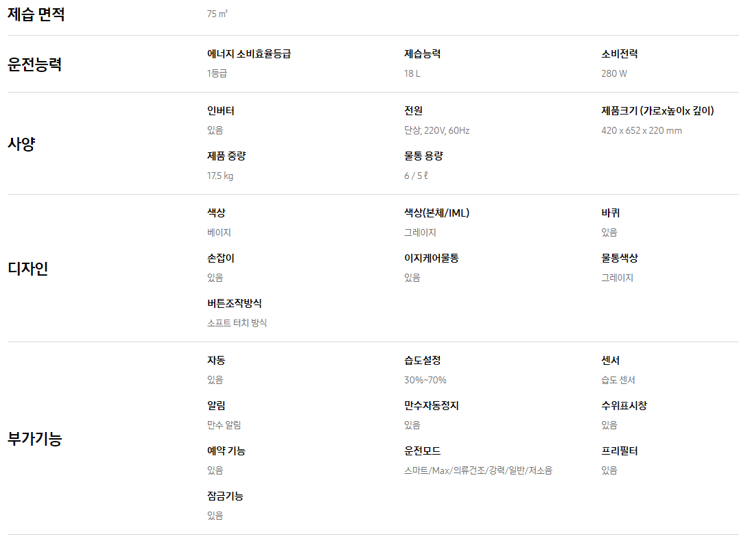 가습기 알아보실 때 반드시 체크해야 하는 부분는 1일 제습용량과 물통용량입니다