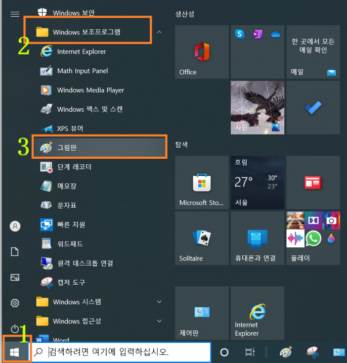 윈도우 시작프로그램 => 윈도우 보조프로그램 => 그림판