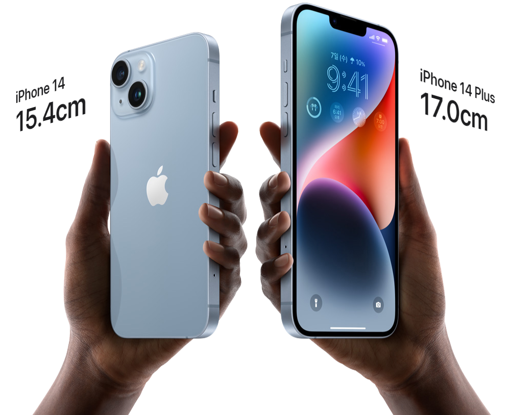 아이폰13 시리즈와 달라진 점은 아이폰 라인업 중 5.4인치 #아이폰미니 모델이 퇴장하고 6.7인치 #아이폰플러스 모델이 등장했습니다. 아이폰14플러스의 스펙은 아이폰14와 같으며 화면크기는 아이폰14프로맥스와 같은 6.7인치 큰화면을 채택했습니다.큰 화면을 선호하시는 분들의 선택지가 하나 더 늘었구요