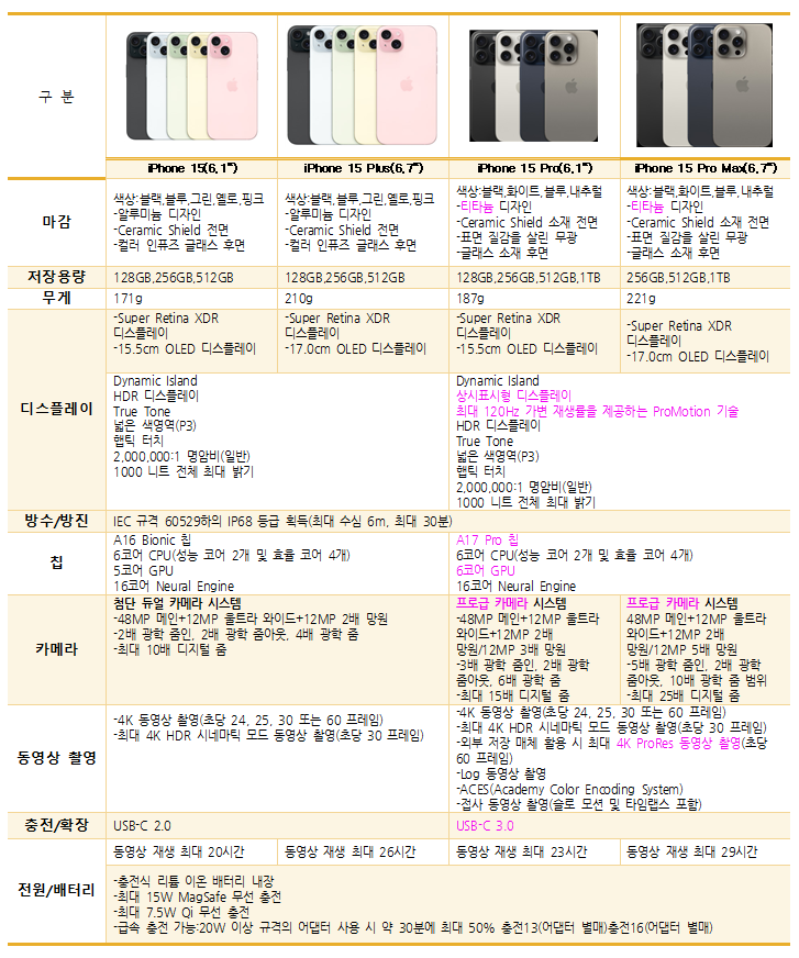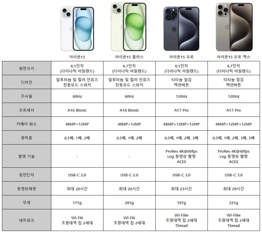 아이폰15:아이폰15플러스,아이폰15프로,아이폰15프로맥스 스펙비교