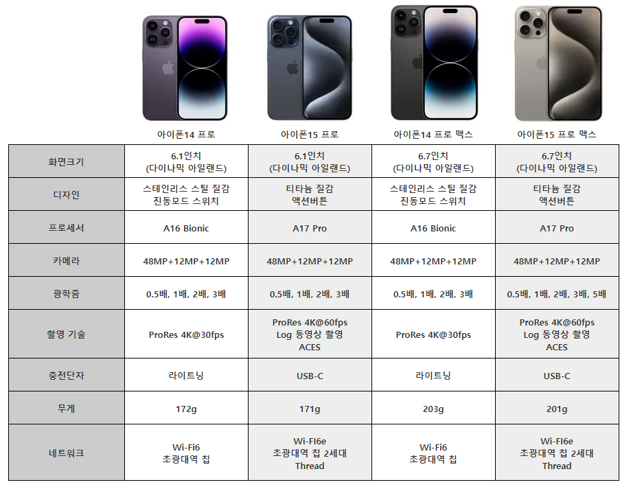 아이폰14프로:아이폰15프로,아이폰14프로맥스:아이폰15프로맥스 스펙비교