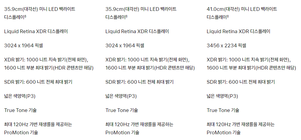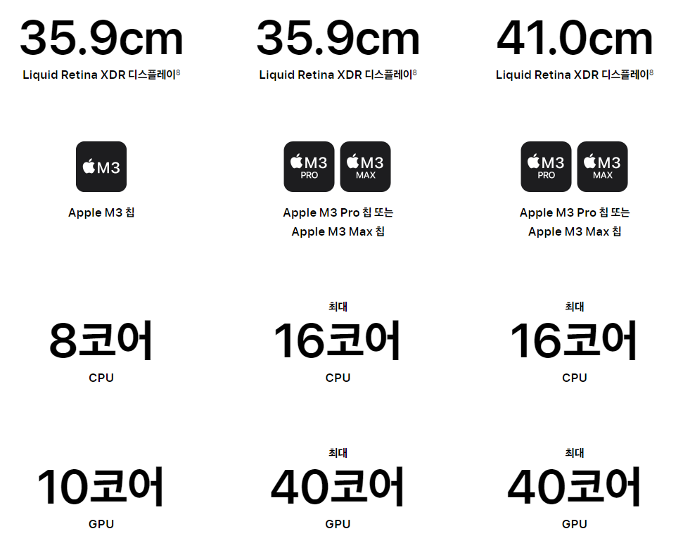 맥북프로 14(m3) / 맥북프로 14(m3 Pro,m3 Max) / 맥북프로 16(m3 Pro,m3 Max)로 아래와 같이 가격과 스펙이 구분됩니다