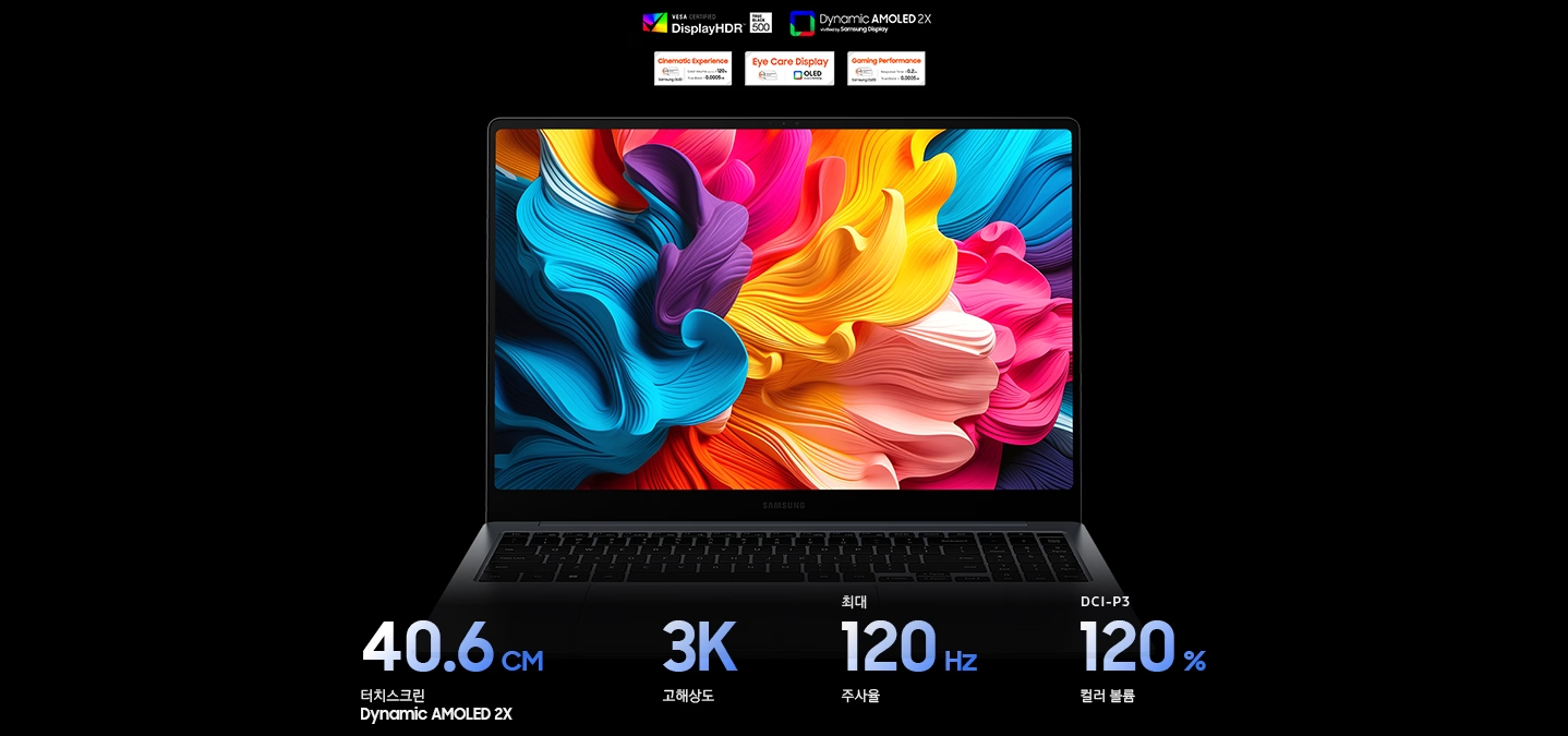 | 디스플레이 | 40.6cm(16인치) / 화면비 16:10 / 해상도 2880x1800(WQXGA+) /색재현율 DCI-P3 120% / 밝기 400nit / 주사율 120hz / 패널 D-AMOLED 2X /Anti-Reflective, 터치스크린 |