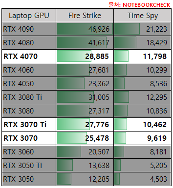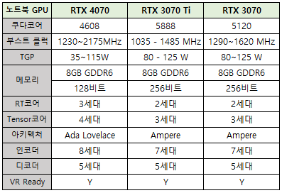 | 그래픽 | - NVIDIA GeForce RTX 4050 Laptop GPU 6GB GDDR6(80 W TGP, Boost Clock 2055 MHz) - NVIDIA GeForce RTX 4070 Laptop GPU 8GB GDDR6(80 W TGP, Boost Clock 1605 MHz) |