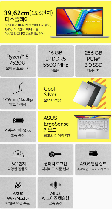 비보북 고 15는 클래식한 쿨실버 색상이며 가방에 손쉽게 넣을 수 있을 만큼 슬림하고,한 손으로 간편하게 휴대할 수 있을 만큼 가볍습니다