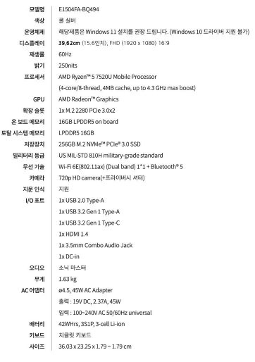 - 모델명 : ASUS 비보북 고 15(E1504FA-BQ494)