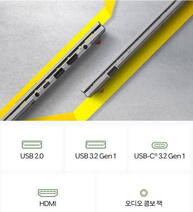 - 입출력단자 : HDMI / 웹캠(HD) / 단자 USB-C: 1개 / USB-A: 2개