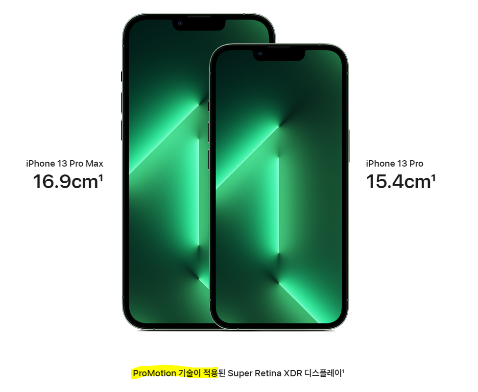 아이폰13프로와 아이폰13프로맥스 역시 무게와 크기만 다르며 스펙은 동일합니다