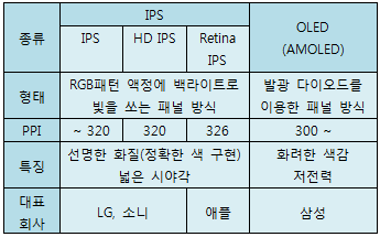 스마트폰/태블릿 패널은 IPS-LCD 방식과 OLED방식이 주로 사용됩니다.PLS-LCD는 삼성에서 개발한 광시야각 패널로, IPS와 거의 동일한 기술로써, 갤럭시탭 또는 삼성 고급형 모니터 라인업에 사용됩니다.PPI의 경우 매년 기술 수준에 따라 계속해서 높아지고 있으므로 해당 표의 수치가 절대적인 수치는 아닙니다. 인간이 최대로 인식 할 수 있는 PPI 수치는 440 이며 보통 300 PPI 이상은 인식하기 어려운 수준입니다.