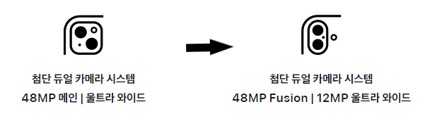 | 카메라 | 후면 | 메인: 48MP, ƒ/1.6 조리개 울트라 와이드: 12MP, ƒ/2.4 조리개 |