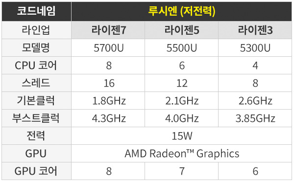 2021년 1월 7나노(nm) CPU(중앙처리장치) ‘라이젠(Ryzen) 5000’ 시리즈가 탑재된 노트북이 출시되었습니다.라이젠 5000 시리즈는 데스크톱용 4세대 라이젠에 적용된 젠3(Zen3) 코어를 모바일화한 '세잔'과 기존 젠2(Zen2) 기반의 '루시엔'이 출시된 제품입니다. 라이젠 5000 시리즈는 CPU와 AMD 라데온(Radeon) 베가(Vega) GPU(그래픽처리장치)를 결합한 ‘APU’입니다.