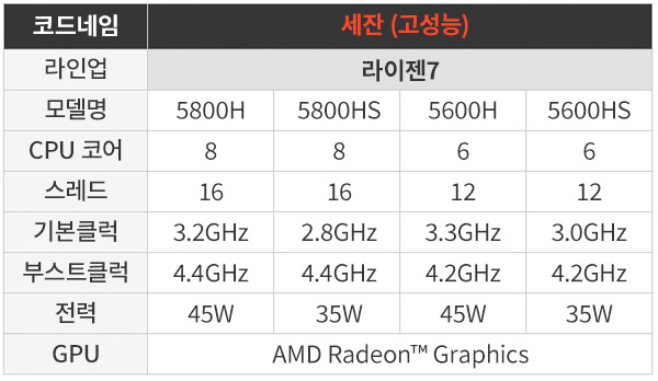 | Ryzen U / H / HX / HS | 노트북용 (저전력/고성능) | Ryzen 9 7940HS |