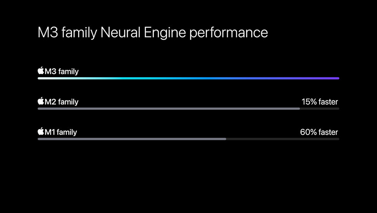 3나노미터 공정 기술로 제작 M3의 경우 M1 대비 60% 향상된 Neural Engine 처리 속도(18TOPS)를 갖추었으며, 2세대 3나노미터 공정으로 제작된 M4에 이르러 A11 Bionic 칩에 최초로 탑재된 Neural Engine 대비 60배 더 빠른 놀라운 속도를 달성합니다.