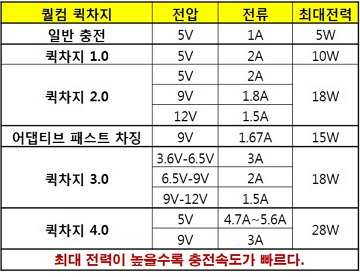 | 퀵차지 4.0 | 5V | 4.7~5.6A | 최대 28W |