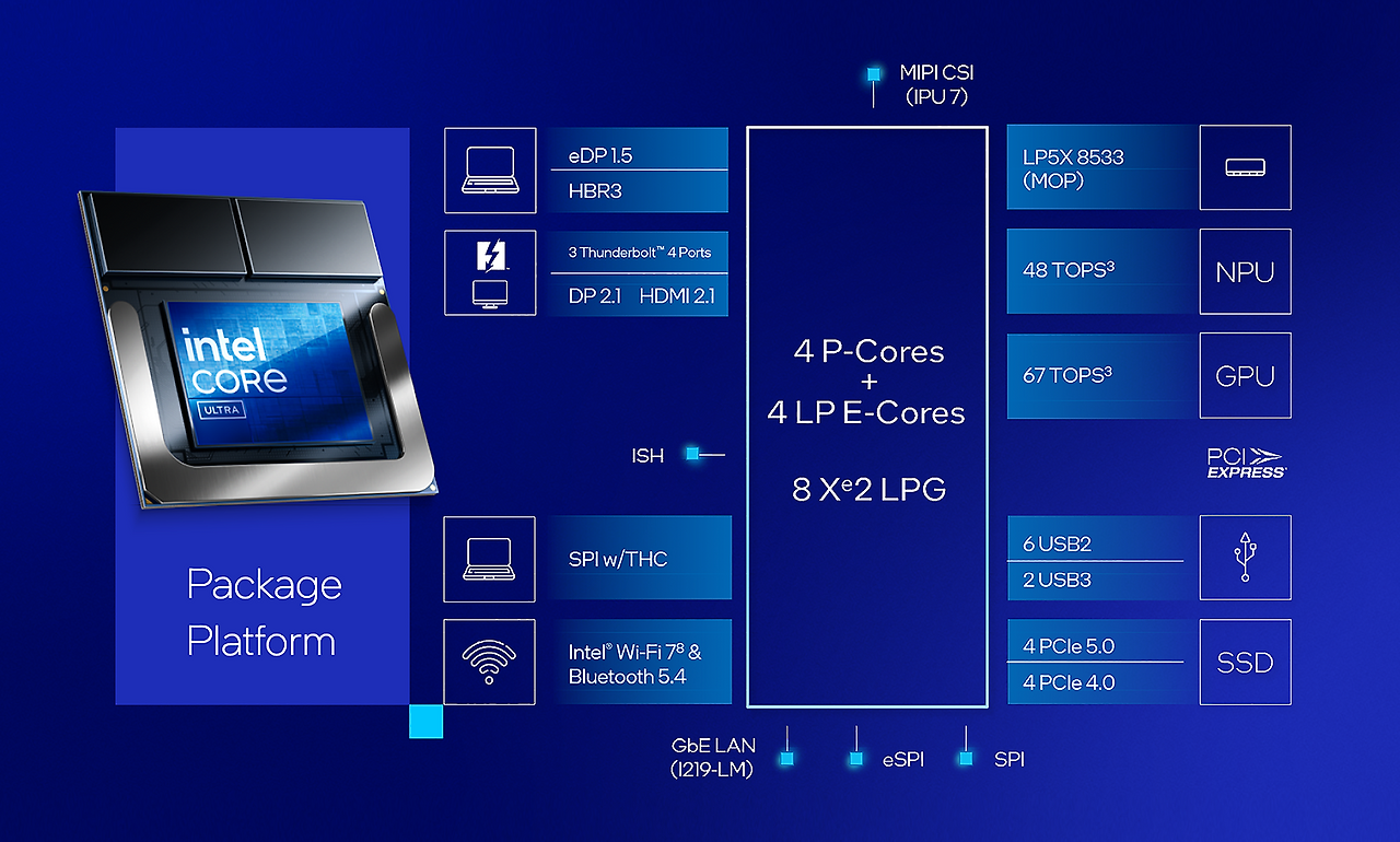 NPU 개수는 라인업에 따라 5개~6개로 다르며, GPU도 모두 인텔 Arc로 동일하나, Xe 코어 숫자가 7개 또는 8개로 구성이 다릅니다 . 메모리는 16GB 및 32GB LPDDR5X 8533MT/s 제품이 탑재됩니다.
