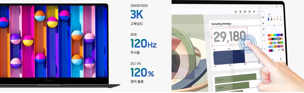 - 크기 : 40.6cm(16인치) - 화면 비율 : 16:10 - 해상도 : 2880x1800(WQXGA+) - DCI-P3 : 120% - 밝기 : 400nit - 주사율 : 120Hz - 패널 : D-AMOLED 2X - 광시야각 - 터치스크린 |