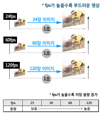 비디오나 영화 TV등의 영상은 정지된 한장의 이미지를 빠르게 바뀌면서 보여지면 영상으로 표현됩니다.이때 초당 몇 장의 이미지로 보여지는가에 따라 영상의 표현력이 달라집니다.이러한 초당 표현되는 이미지의 수를 fps등으로 표기합니다.