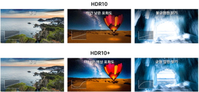 밝은 부분과 어두운 부분의 밝기 차이를 확장시켜 사람이 실제 눈으로 보는 것에 가깝게 구현된 HDR 규격의 상위버전으로 HDR10은 장면이 바뀌어도 동일한 컬러와 밝기를 적용하는 정적 메타데이터가 사용되지만 HDR10+은장면별로 메타데이터를 자동설정하는 동적 메타데이터가 적용되어 모든 장면을 최적화된 화질로 제공합니다.