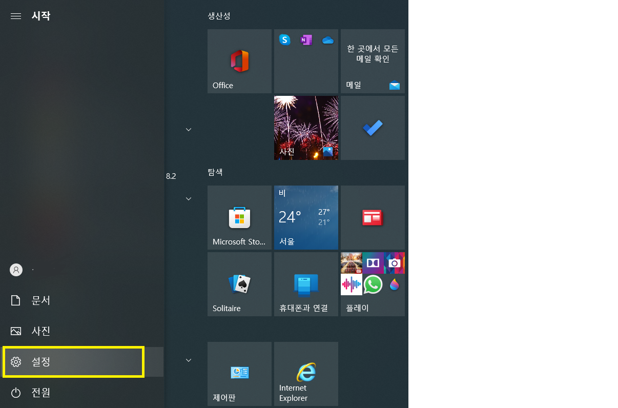 1. 윈도우 시작탭에서 설정 클릭합니다