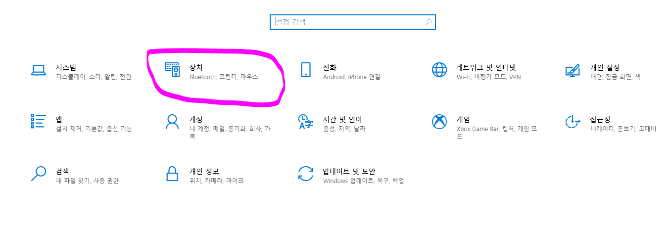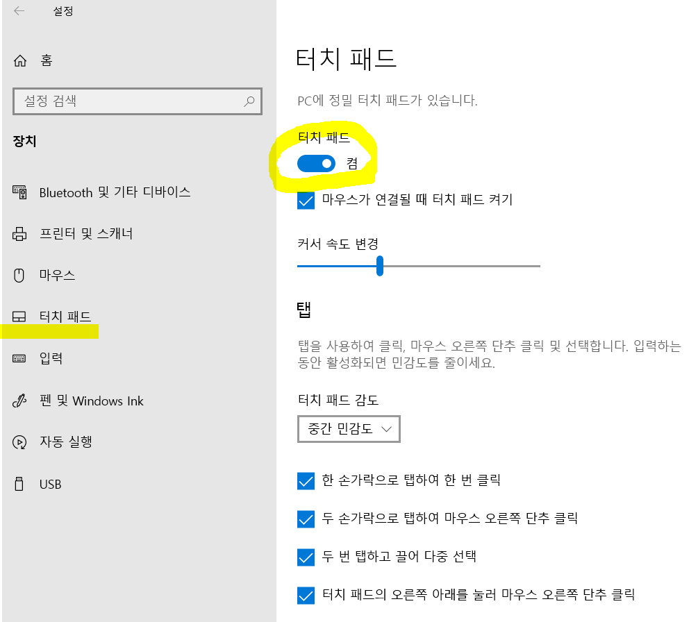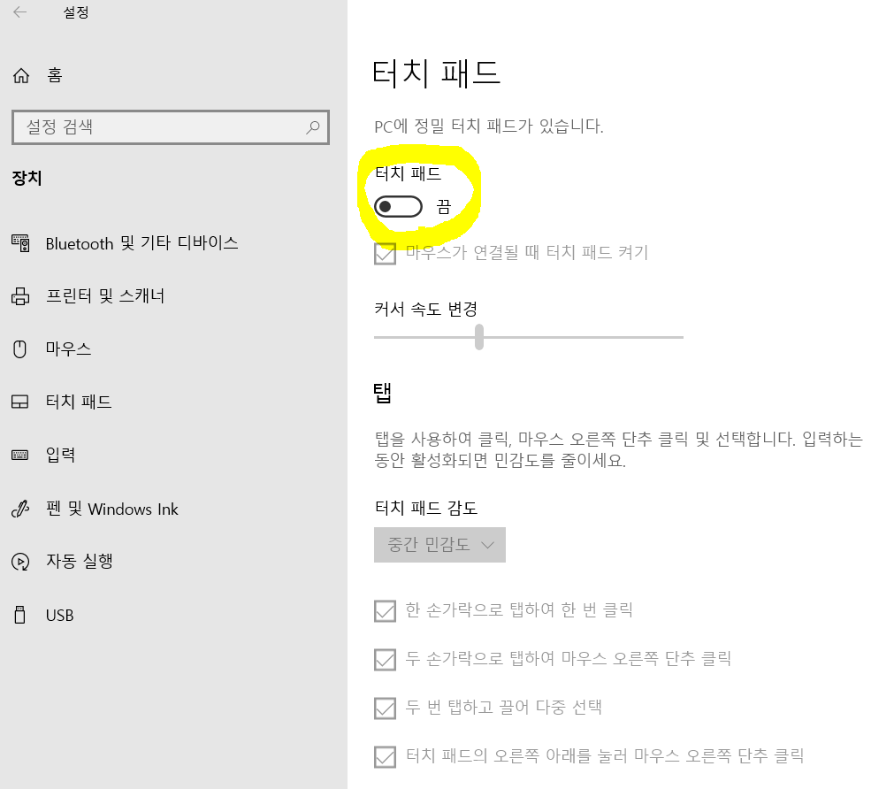 다시 설정에서 <켬>으로 바꾸지 않는 한 터치패드는 동작하지 않습니다