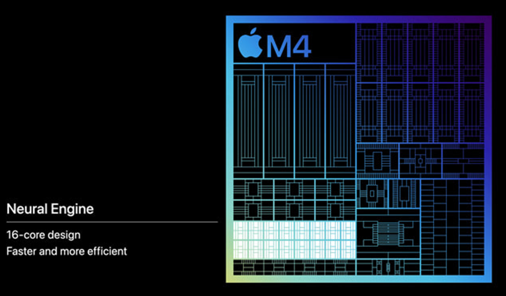 2024년 5월 Apple Silicon M4가 공식 발표되었습니다. 2세대 3나노미터 공정으로 제작된 시스템 온 칩(SoC, System on Chip)인 M4는 Apple 역대 가장 빠른 Neural Engine 역시 탑재합니다. (초당 38조 회에 달하는 연산 처리 능력 = 38TOPS)