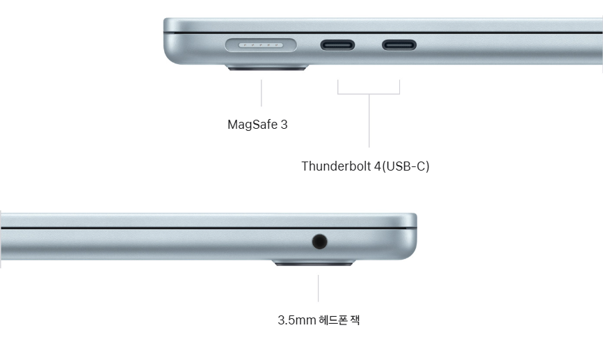 - MagSafe 3 포트 - 3.5mm 헤드폰 잭 - 3.5mm 헤드폰 잭 - DisplayPort - Thunderbolt 4(최대 40Gb/s) - USB 4(최대 40Gb/s) |